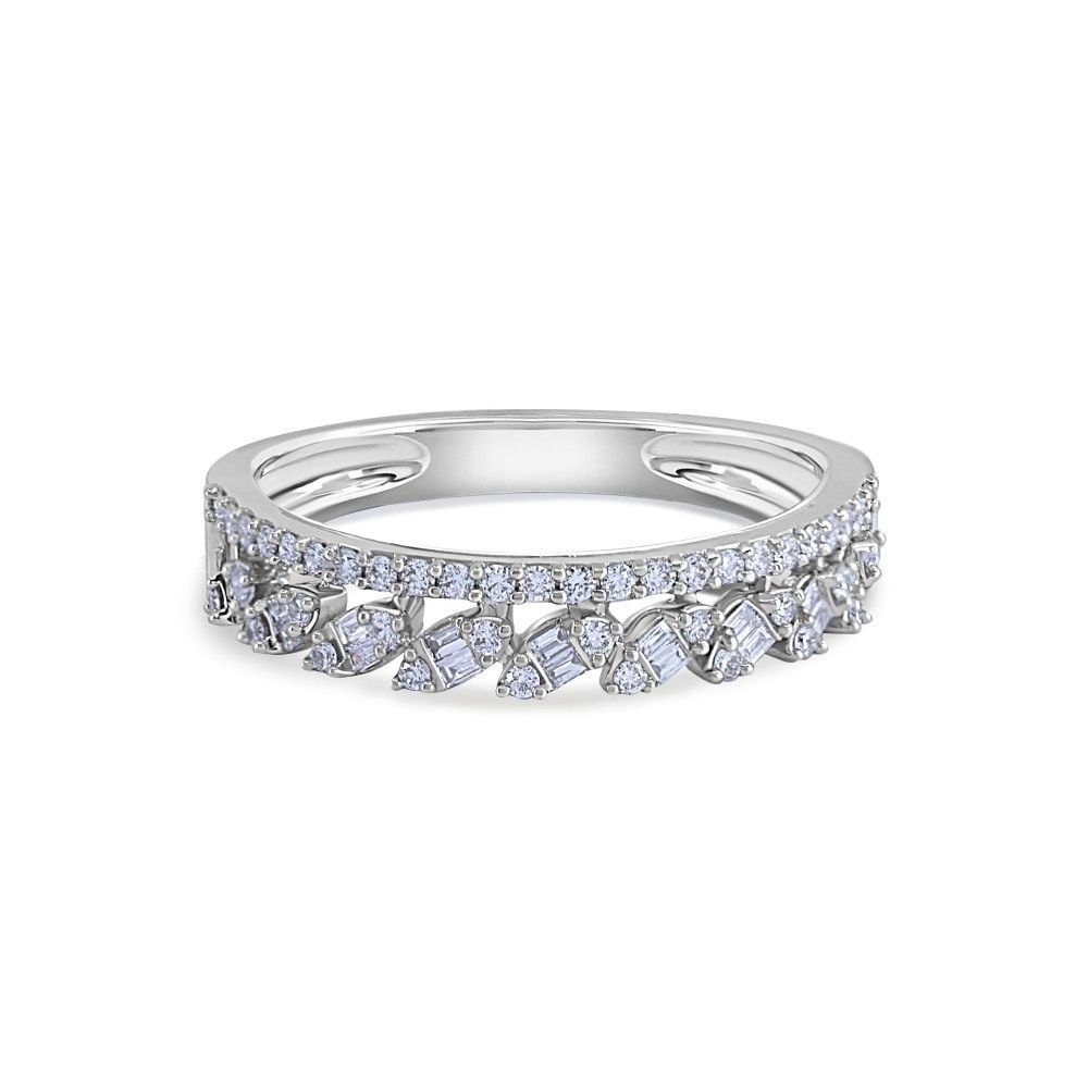 This asymmetrical 18k white gold diamond band blends vintage inspiration with contemporary elements, making it the perfect selection for a wedding ring or modern diamond stacking band. Shimmering baguette and round brilliant cut diamonds are prong set in a cascading row of marquise clusters. A classic diamond band on the other side finishes this imaginative two-sided design.