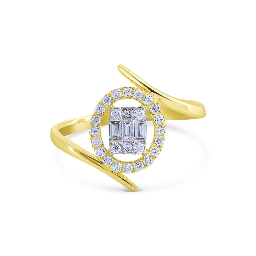 This captivating 18k yellow gold diamond ring features shimmering baguette and round brilliant cut diamonds prong set in a rectangular cluster and floating oval halo. A bypass setting lends a retro-geometric appeal to this pretty ring, made to get notice and perfect for wearing day or night.