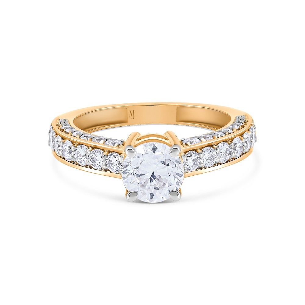Choose luxury for your special moment with this brightly polished 18k rose gold diamond engagement ring. A sparkling round brilliant cut diamond solitaire nestles in a four-prong claw setting. Glittering round brilliant cut diamonds channel/prong set on the sides of a 3D band add undeniable elegance.