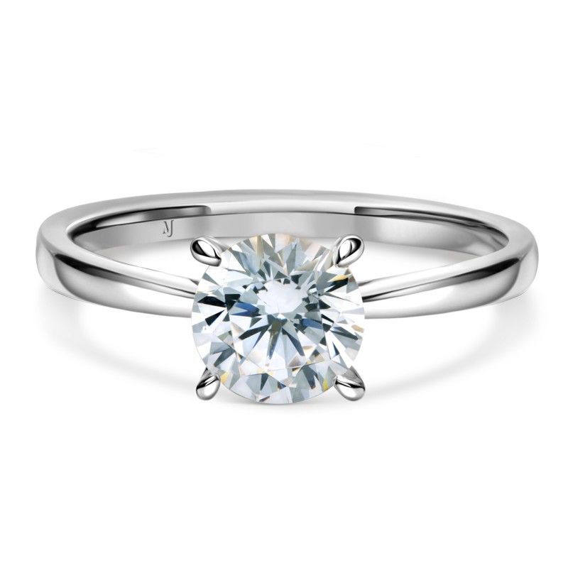 This brightly polished 18k white gold diamond engagement ring showcases a round brilliant cut diamond solitaire secured in a four-prong claw basket setting. Cut-out work with a tulip design creates airy spaces in this pretty design, all on top of a modern, streamlined Cathedral mounting. A slim band finishes the look.