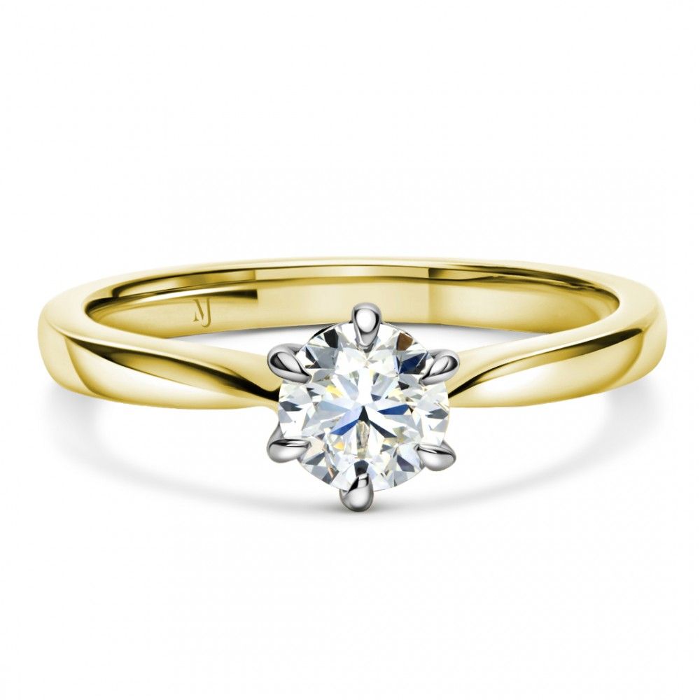 Elevate your bridal ring set with the classic look of elegance by choosing this 18k yellow gold diamond solitaire engagement ring. A scintillating round brilliant cut diamond sits in a six-prong claw setting in white gold accenting. A tapered semi-mount style shank amplifies the sparkle of the diamond, all in a rich shine.